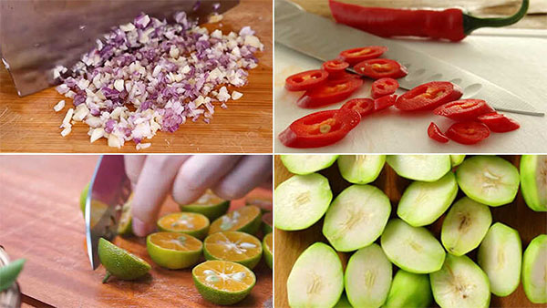 Đầu tiên, bạn băm nhỏ 20g sả và 20g hành tím. Sau đó, bạn đem 20g ớt đi cắt lát mỏng, còn 50g tắc và 100g cóc non thì bổ đôi.
