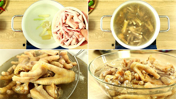 Bạn rửa sạch 500g chân gà, cắt móng và chặt đôi. Sau đó, bạn đem chúng đi luộc cùng 10g gừng và 10g sả cho thơm và loại bỏ mùi hôi khoảng 10 phút. Xong thì bạn vớt ra, ngâm ngay vào nước lạnh cho chân gà giòn hơn, rồi để ráo.