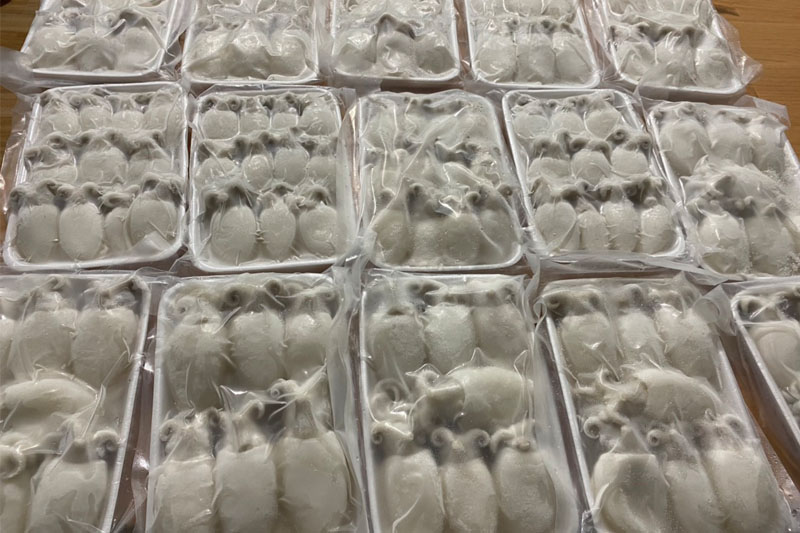 Mực có kích cở trung bình 3-5cm, trọng lượng 10-20 con/kg, có thân tròn, da màu trắng đục, thịt dai giòn